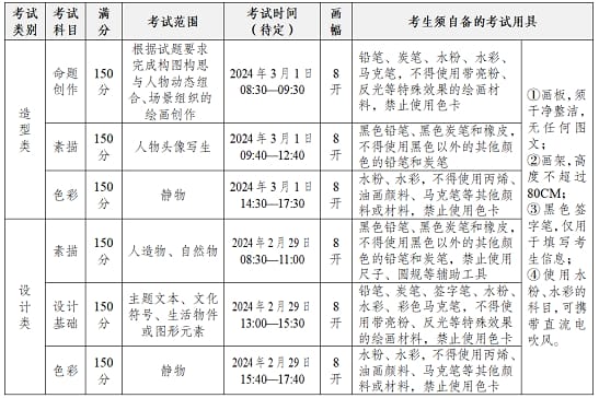报名参加校考的考生,只能在造型类和设计类中选择一类报考,不可兼报。学校校考分为初试和复试两个阶段,初试成绩达到复试资格分数线的考生方可参加复试。复试按造型类、设计类两个类别分别发放校考合格证,合格证发放数不超过对应类别招生计划数的4倍。